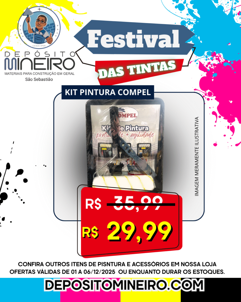 Festival das Tintas no Depósito Mineiro de São Sebastião! Kit rolo, bandeja e pincel Compel: de R$35,99 por apenas R$29,99. Acessórios práticos para pintura rápida e eficiente. Oferta válida até durar o estoque.