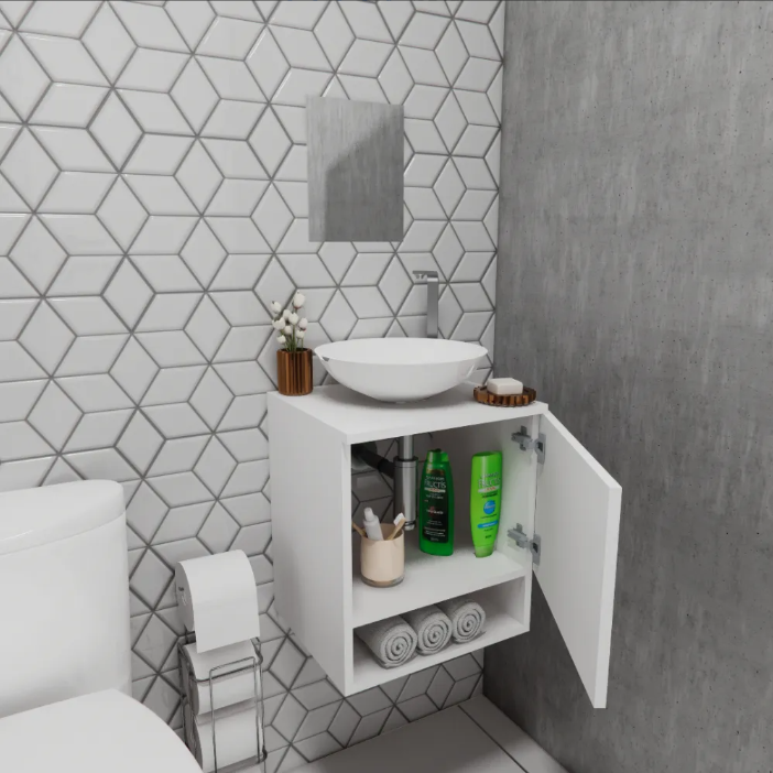 Fabricado em MDP de 15mm, o Gabinete Germânia é resistente à umidade, ideal para ambientes como banheiros.