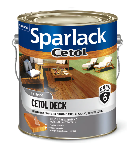 Cetol Deck é um ultra protetor elástico, que não trinca e não descasca. Resistente ao tráfego de pessoas. Durabilidade de 6 anos. Proteção máxima para madeiras expostas ao sol e à chuva e com ação contra fungos e bolor. Forma uma película elástica, capaz de acompanhar os movimentos naturais de dilatação e contração da madeira. Fissuras, trincas e rachaduras que aparecem na estrutura da madeira não se enquadram como movimentos naturais. Nesses casos, Cetol Deck não é capaz de acompanhar as deformações da superfície.