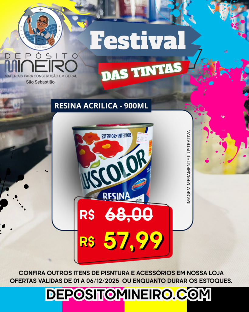 Festival de Ofertas de Tintas e Acessórios no Depósito Mineiro de São Sebastião, veja essa oferta: Resina Acrílica Lukscolor 900ml: de R$68,00 por apenas R$57,99.