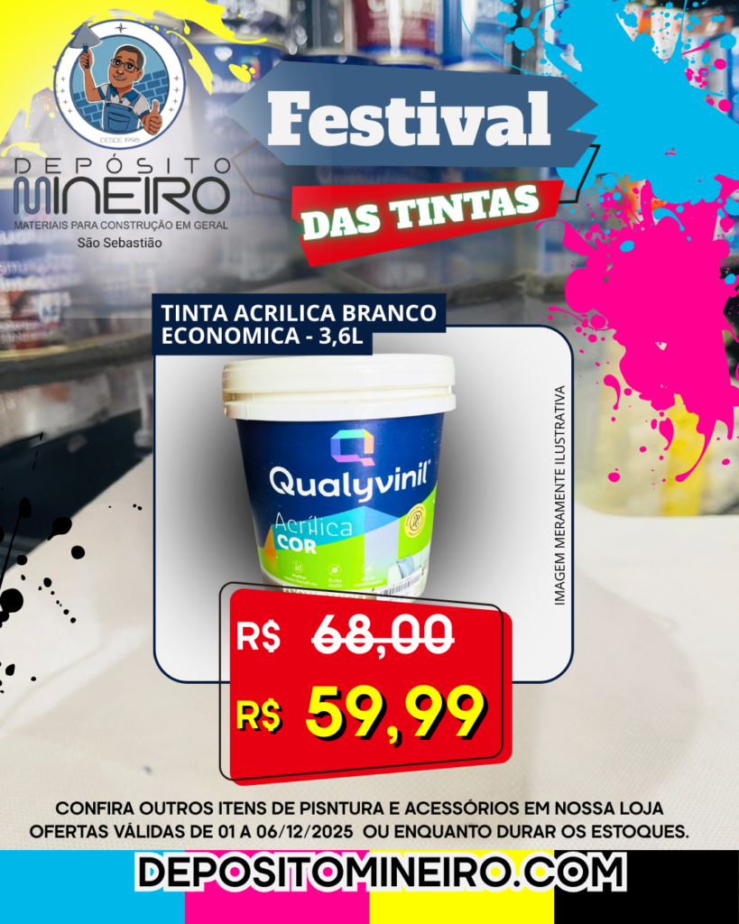 Festival de Ofertas de Tintas e Acessórios no Depósito Mineiro de São Sebastião, veja essa oferta: Tinta Acrílica Econômica Qualyvinil 3,6L Branca: de R$68,00 por apenas R$59,99.