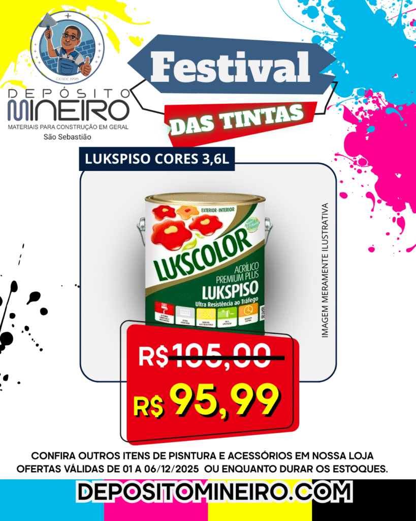 Festival das Tintas no Depósito Mineiro de São Sebastião! Tinta Lukspiso 3,6L: de R$105,00 por apenas R$95,99. Ideal para pintar pisos com acabamento resistente e duradouro. Oferta válida até durar o estoque.